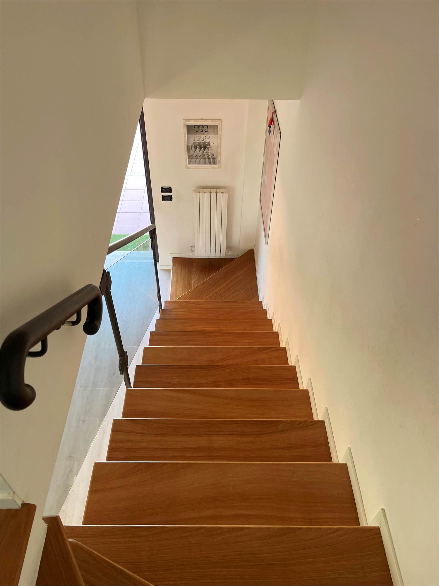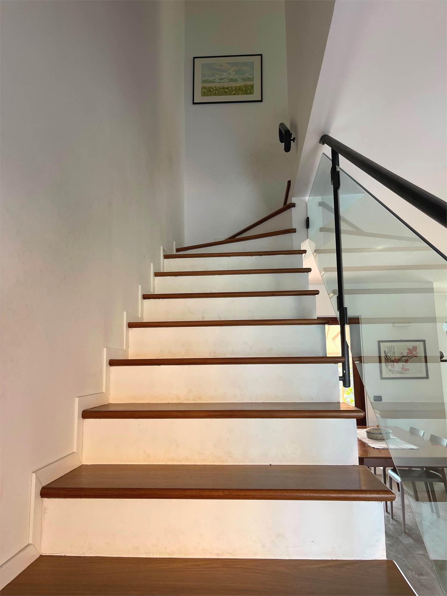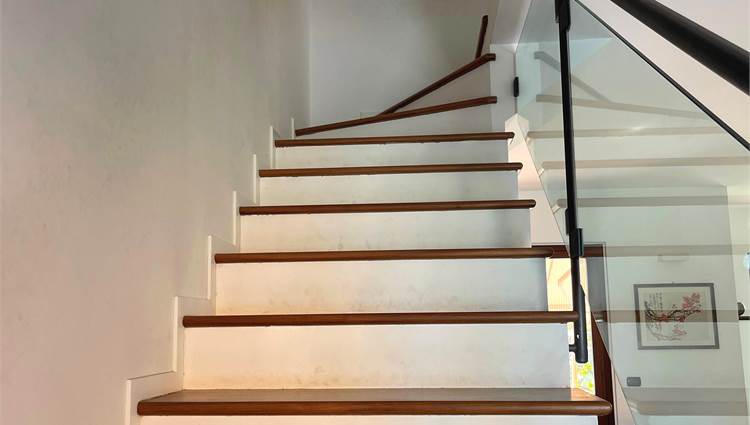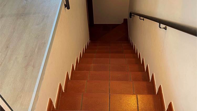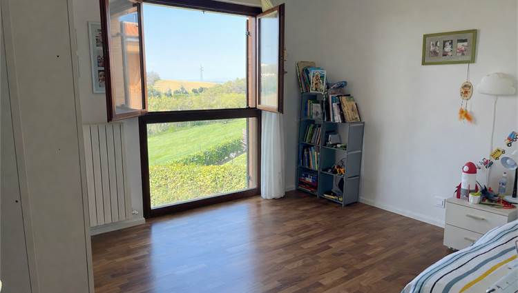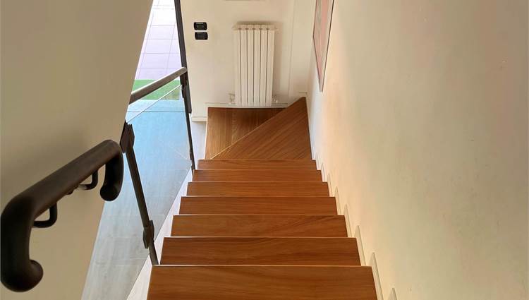 La scala, elegante e di design, con pedata in legno e ringhiera in ferro e vetro, accompagna al piano notte, dove troviamo tre camere da letto (di cui una con balcone) e un bagno. Sul pianerottolo è presente un comodo armadio a muro. In questo livello, il caldo parquet color noce valorizza gli ambienti, mentre gli affacci aperti sulla campagna garantiscono privacy e tranquillità.