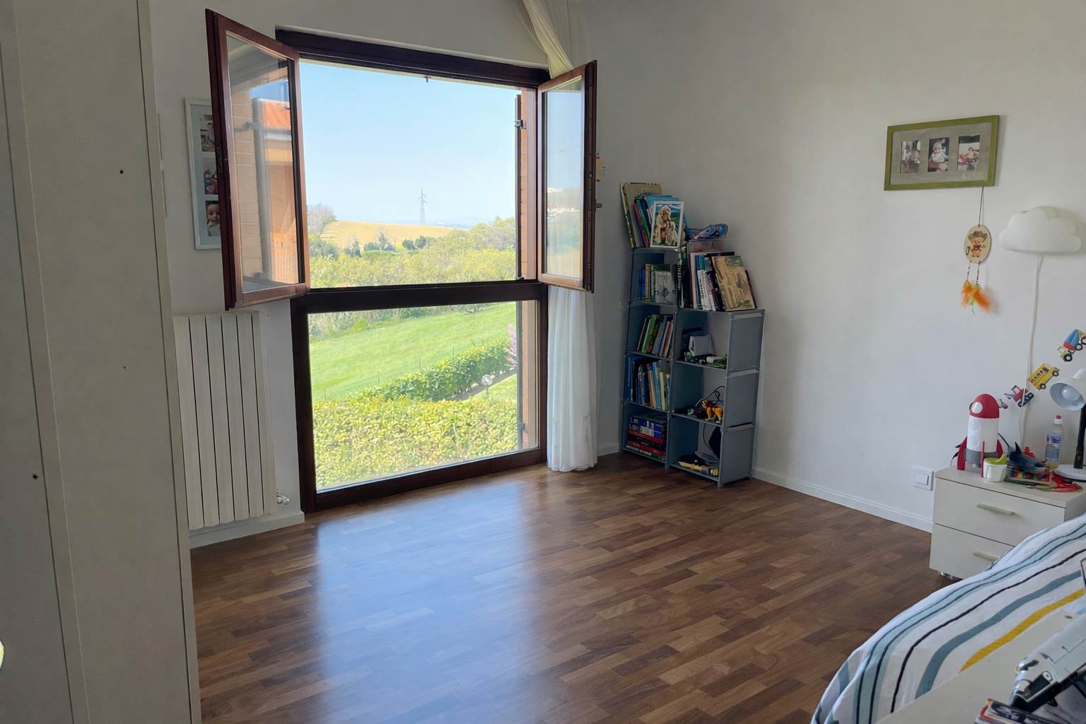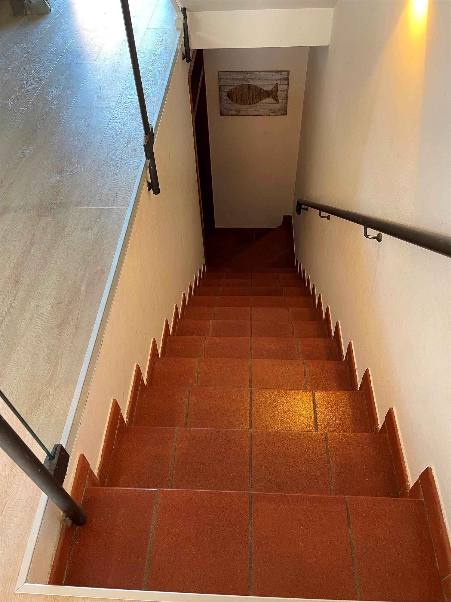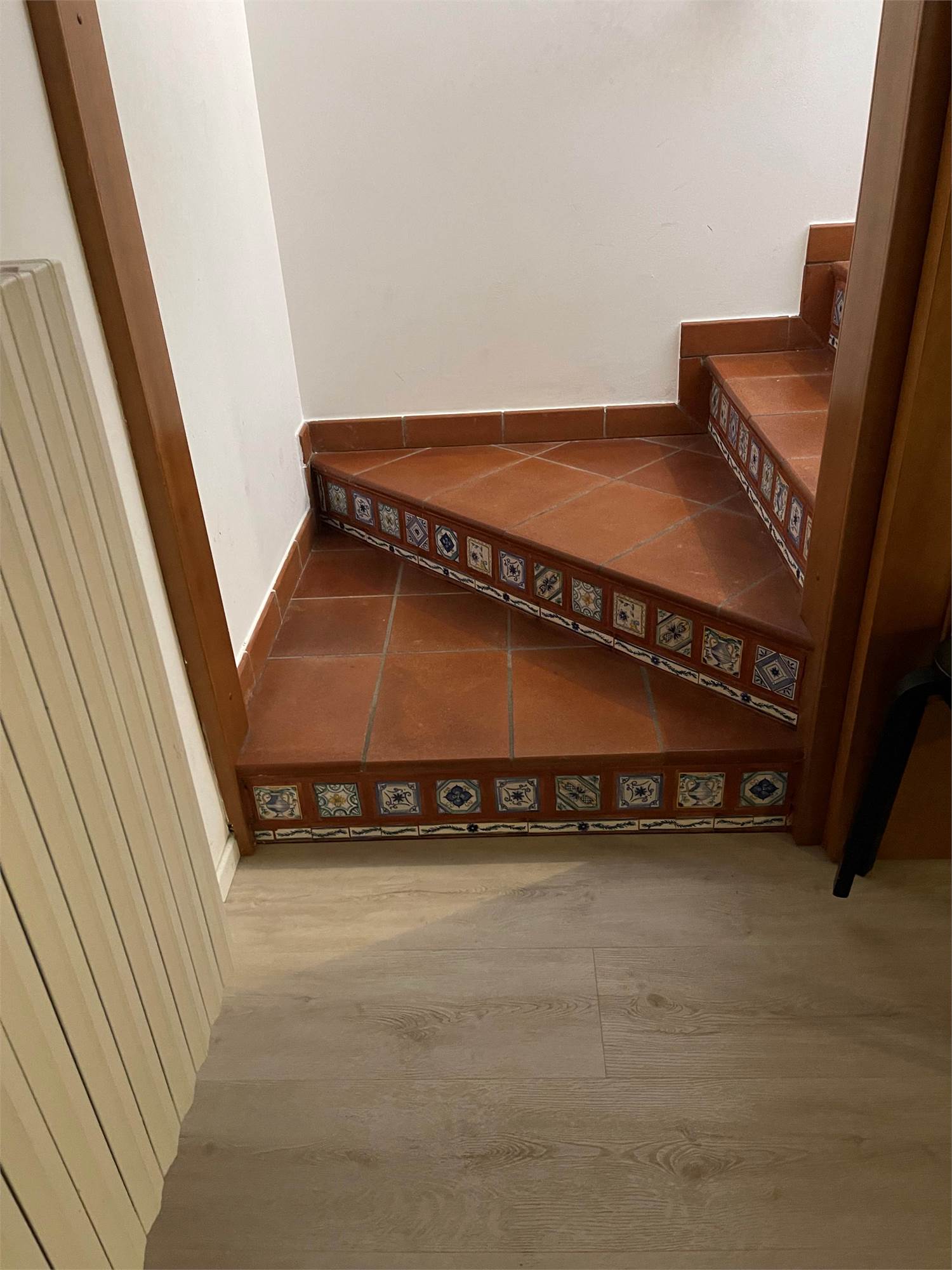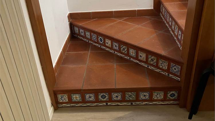 La scala, elegante e di design, con pedata in legno e ringhiera in ferro e vetro, accompagna al piano notte, dove troviamo tre camere da letto (di cui una con balcone) e un bagno. Sul pianerottolo è presente un comodo armadio a muro. In questo livello, il caldo parquet color noce valorizza gli ambienti, mentre gli affacci aperti sulla campagna garantiscono privacy e tranquillità.